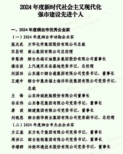 日前,中共煙臺市委、煙臺市人民政府公布了2024年度煙臺市優(yōu)秀企業(yè)家名單,集團公司唐波董事長(cháng)榮獲“2024年度煙臺市功勛企業(yè)家”稱(chēng)號。